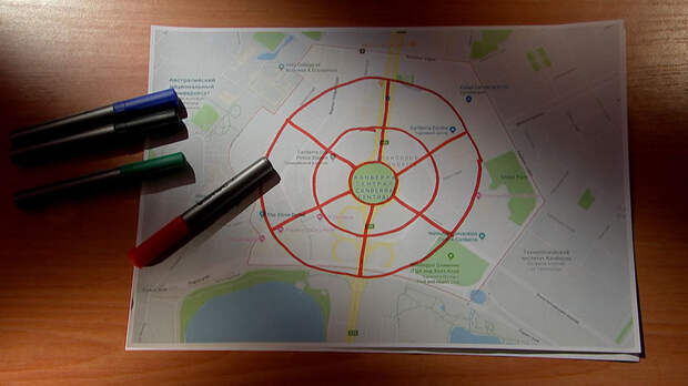 Столица Австралии тоже не просто город. Канберра построена в виде колёс и спиц. Идея проста – в окружностях находятся важные объекты, а спицы – это основные магистрали. Архитектор Уолтер Берли Гриффин хотел сделать идеальный город – вместительный, удобный и зелёный.