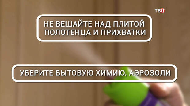 Не вешайте полотенца и прихватки рядом с плитой. Не держите на кухне бытовую химию и аэрозоли.