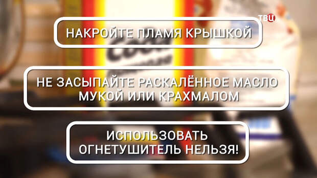 Засыпать раскалённое масло мукой или крахмалом нельзя. Они только усилят пожар. Огнетушитель тоже под запретом.