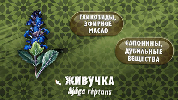 В химический состав живучки входят метаболиты, флавоноиды, сапонины, дубильные вещества, гликозиды и эфирное масло. Основные действующие вещества – ажугол, ажугозид отвечают за вяжущее, спазмолитическое, противовоспалительное действия. Флавоноиды, дубильные вещества, сапонины отвечают за антиоксидантное, желчегонное, мочегонное действие. Живучка ползучая – эффективное натуральное средство при гастритах, заболеваниях печени и желчного пузыря, признано в народной медицине России. Наружно настой травы используют в виде обмываний, примочек при ожогах, ранах и язвах. А в виде полосканий – при болезнях полости рта и ангинах.