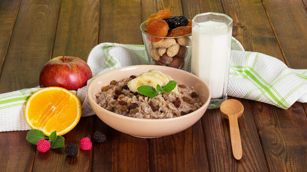 Ну тогда − тарелка овсяной каши, приготовленной на воде. Практически не содержит жиров, богата белком, пищевыми волокнами, микроэлементами. Калорийность 150 калорий на порцию.