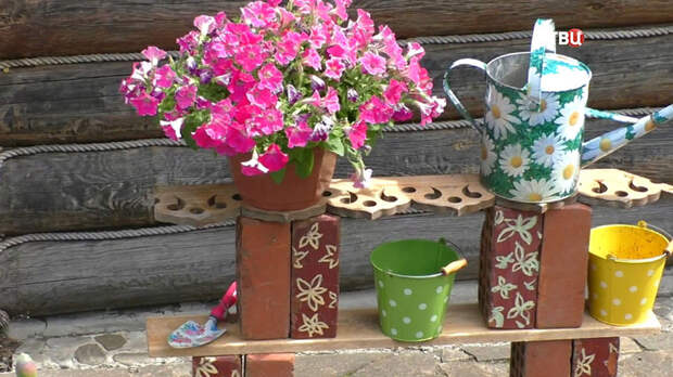 Стеллаж может быть функциональным, а может занять место главного арт-объекта на дачном участке, стоит только украсить его. Идей для творчества много: альпийские горки, скульптуры из цветов и просто необычные клумбы.