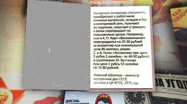 "Указанную литературу спекулянты приобретают у работников книжных магазинов, складов и баз книготорговой сети, получают по подписке, покупают у граждан, а затем перепродают по повышенным ценам. Например, книга А. П. Керн "Воспоминания" перепродаётся по 25–30 рублей за экземпляр при номинальной цене 86 копеек, роман С. и А. Галон "Анжелика" при цене 2 рубля 2 копейки – по 40–50 рублей, а однотомник М. Булгакова при цене 1 рубль 53 копейки – по 75–80 рублей". Николай Щёлоков, министр внутренних дел СССР. З записка в ЦК КПСС, 1975 год.