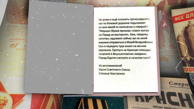 – Не успел я ещё осознать происшедшего, как по боковой дорожке подъезжает ко мне какой-то полковник и передаёт: "Маршал Жуков приказал знамя завтра на парад не выставлять. Вам, товарищ капитан, надлежит сейчас же на моей машине отправиться в Музей Вооружённых сил и передать туда знамя на вечное хранение. Пропуск на Красную площадь получите в Ворошиловских казармах. Парад будете смотреть в качестве гостя".