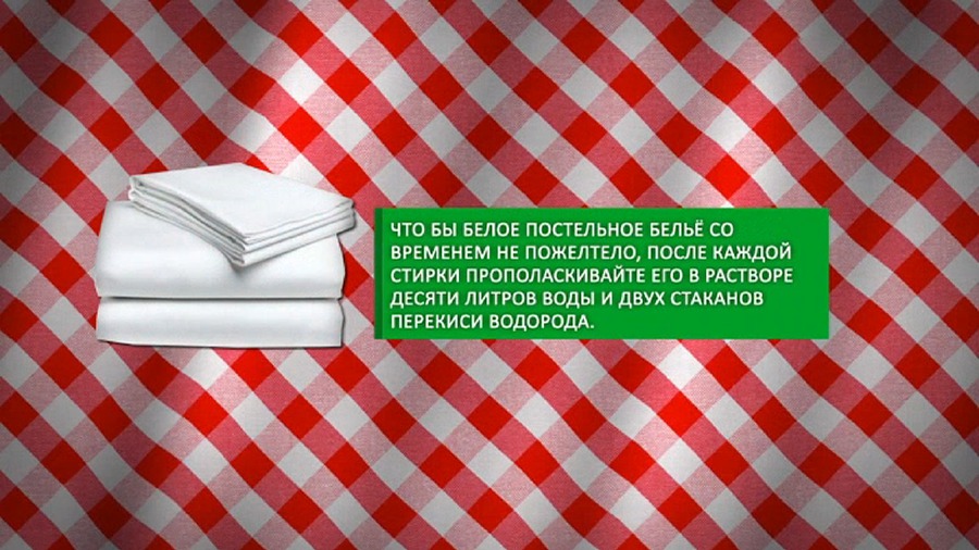 Прополощите белое бельё или полотенца в воде с добавлением стакана перекиси водорода. Это поможет вещам не пожелтеть со временем.