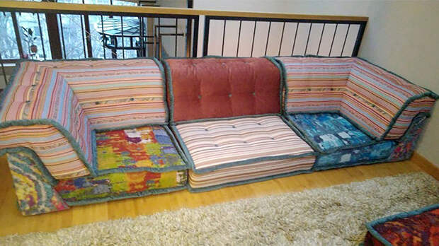 Сиденья просижены, подлокотники потёрты до блеска, на спинке – затёртые пятна от кофе, детского мороженого или случайно пролитого вина. Ткань вытянулась, швы распустились, а угол – тот самый, куда вы всегда кладёте ноги, – теперь напоминает старую подушку без перьев.