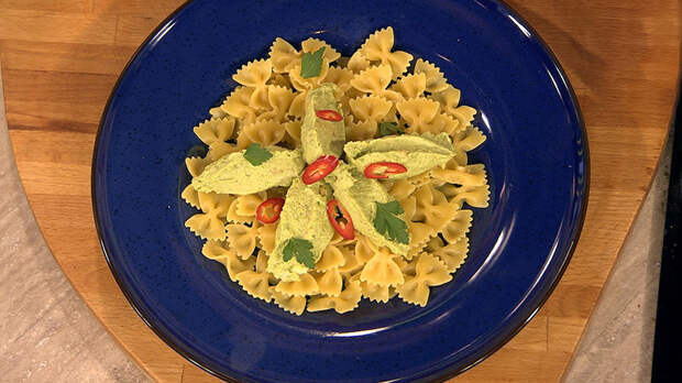 Пока наши бантики варятся, приготовим крем. Для этого очищаем авокадо, добавляем каплю лимонного сока, сыр, орехи, зелень петрушки, соль, перец и нерафинированное оливковое масло. Всю эту красоту отправляем в блендер.