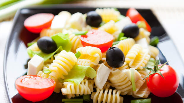 Приправим пасту соусом и тщательно перемешаем. Далее следует закрыть миску плёнкой и поставить в холодильник на 3 часа, а лучше на всю ночь. Этот салат нужно подавать холодным или комнатной температуры.