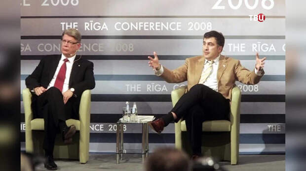 На встрече с экс-президентом Латвии у Михаила Саакашвили были слишком короткие носки, либо слишком короткие брюки. В любом случае, как бы там ни было, если мужчина садится в позу "нога на ногу", полоски голой ноги быть не должно.