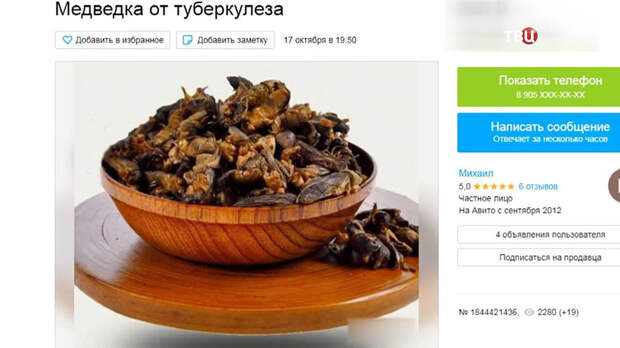 Накормили Жанну медведкой в элитном китайском спа-отеле. Необычный ингредиент входил в состав коктейля для иммунитета, который девушке давали каждый раз перед процедурами. У нас же медведку, как и других якобы целебных насекомых, можно найти по объявлению. От онкологии, например, предлагают жука-знахаря, всего рубль за штуку. Для лучшего эффекта советуют брать сразу тысячу и глотать непременно живьём. Когда их глотают, они испытывают стресс и выделяют вещество, которое как раз и лечит.