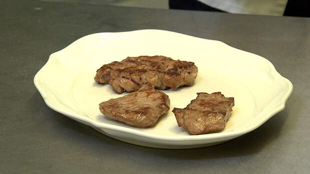 На вид три одинаковых стейка. Но один из них – не сразу и догадаешься! – фальшивый. Ноу-хау пищевой промышленности – отходы, слепленные с помощью специального средства.