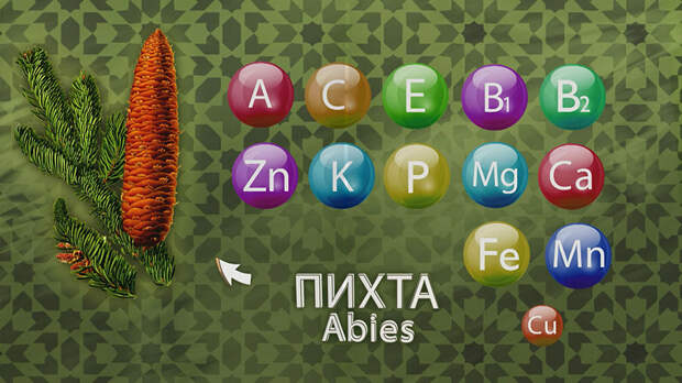 В химический состав пихты входят флавоноиды, дубильные вещества, витамины А, С, Е, В1 и В2, макро- и микроэлементы: цинк, кальций, фосфор, магний, калий, железо, марганец, медь.
