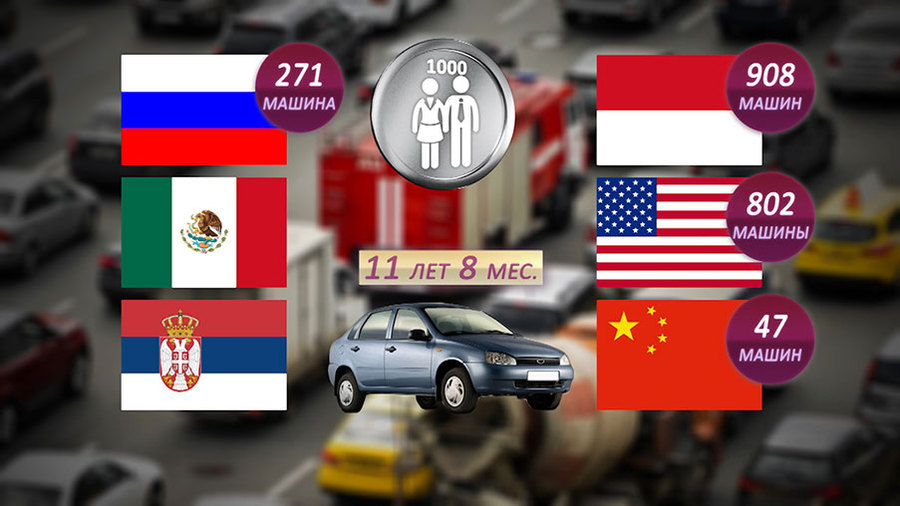 На 1000 человек приходится 271 машина. В рейтинге обеспеченности транспортом Россия оказалась на 46-й позиции из 100 возможных. Считали, правда, не только личные автомобили, но также автобусы, фуры и самосвалы. По соседству с нами расположились Мексика и Сербия. А первое место получило княжество Монако. На 1000 человек там приходится 908 машин. Даже американцев потеснили. У них 802. Интересная история вышла с Китаем. Имея самый большой авторынок в мире, на 1000 местных жителей машин оказалось всего 47. Это 86-е место в рейтинге. Но там и людей в несколько раз больше, чем у ряда стран первой десятки. По данным того же исследования, средний возраст наших машин составляет 11 лет и 8 месяцев.