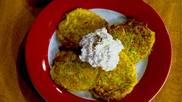 Готовые оладьи можно подавать традиционно со сметаной, а можно и с зернистым сыром!