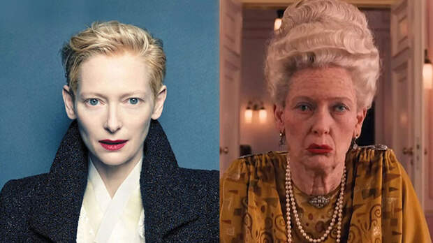 Тильда Суинтон ради съёмок прибавила себе несколько десятков лет и огромный слой грима. Узнать актрису в образе мадам Селин-Вильнёв Дегофф-унд-Таксис вообще нельзя: другие глаза, волосы, форма лица, состаренная кожа. Специалисты трудились над образом по несколько часов перед каждым съёмочным днём. И не зря: фильм "Отель "Гранд Будапешт" получил "Оскар" за лучший грим и костюмы.