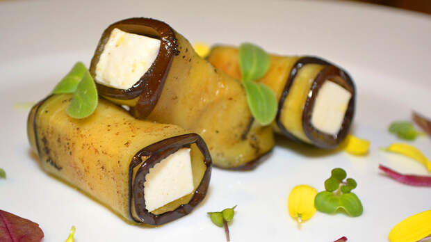 Заранее разогреем духовку до 190 °С. Слегка смажем форму оливковым маслом и посыпем оставшимися панировочными сухарями. Яйца нарежем вдоль: пластинками, как баклажаны. На каждый баклажанный ломтик выкладываем по 1 ст.л. луковой смеси, 1 пластинке яйца и 1 ст.л. томатного пюре. Скручиваем всё это в рулетики, а затем укладываем в форму. Сверху – оставшееся томатное пюре и панировочные сухари. Поливаем всю эту красоту оливковым маслом и отправляем в духовку.