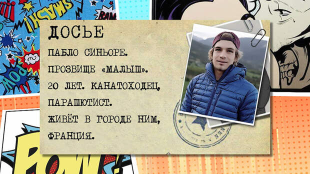 Досье: Пабло Синьоре. Прозвище "Малыш". 20 лет. Канатоходец, парашютист. Живёт в городе Ним, Франция.