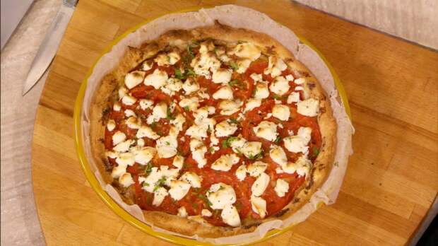 Смазать тесто горчицей и присыпать манкой. Сверху равномерно распределить нарезанный помидор, предварительно слив выделившийся сок.