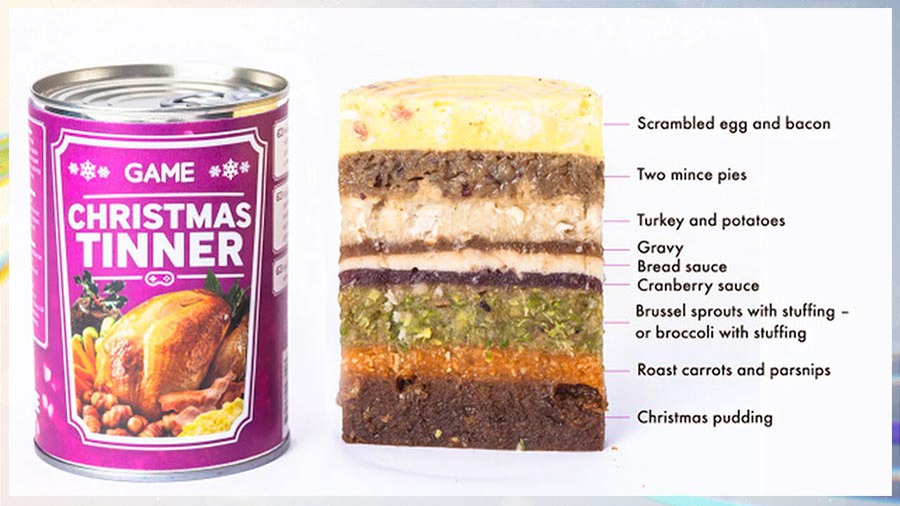 Рождественский обед за 1 фунт и 99 пенсов. 157 рублей по-нашему. Похоже, продавцы видеоигр Британии решили посадить своих клиентов за компьютеры на все праздники, предложив тем консервы, в которых в девять слоёв уложены традиционные угощения: от завтрака к ужину и от омлета с беконом до пряного пудинга. В середине, разумеется, индейка с картофелем и брокколи с фаршем. Не то что готовить – посуду мыть не надо. И даже руки. Гурманами геймеров, конечно, не назовёшь. К каждому новому слою придётся прорываться через желатин. Иначе всё смешалось бы в этих консервах.