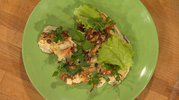 Обжариваем морковь с фасолью с двух сторон, заливаем омлетной смесью. Поджариваем и нарезаем полосками. Можно полить майонезом.