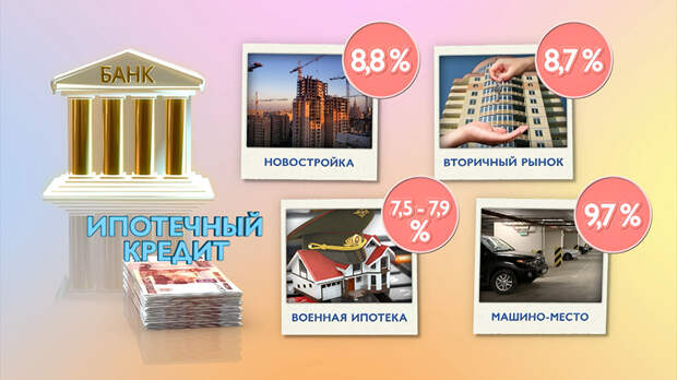 Следующая информация для тех, кто планирует оформлять ипотеку. Сразу два крупных банка повысили ставки. Кредит на строящееся жильё теперь стоит от 8,8%, на готовое – от 8,7%. Это примерно на полпроцента больше, чем раньше. Ставка по военной ипотеке повышена с 7,5 до 7,9%. Ипотеку на гараж или машино-место можно взять под 9,7%.