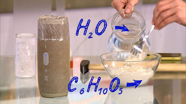Чтобы получить неньютоновскую жидкость, нам будут необходимы всего лишь вода и крахмал. Смешиваем один к одному и получаем некую субстанцию. Затем с помощью обычной пластиковой ложки перенесём данную субстанцию на колонку и украсим результаты этого эксперимента красителями. Мы засыпали жёлтый с синим, поэтому всё у нас получилось зелёным. Но наши зрители могут экспериментировать с любыми цветами.