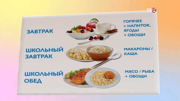 Утром ребёнок обязательно должен плотно позавтракать горячим блюдом и напитком, а также ягодами и овощами. Это дома. Следующие приёмы пищи – завтрак и обед в школе. Если на завтрак были макароны или каша, на обед следует подать мясо или рыбу с овощами. Одни и те же блюда не должны повторяться в течение дня или пары дней подряд.