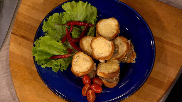 Взбиваем до состояния пюре. Затем солим и перчим пюре по вкусу.Багет режем на ломтики. Их должно быть чётное количество! Ломтики нужно выложить на большой противень или большую тарелку и сбрызнуть маслом.