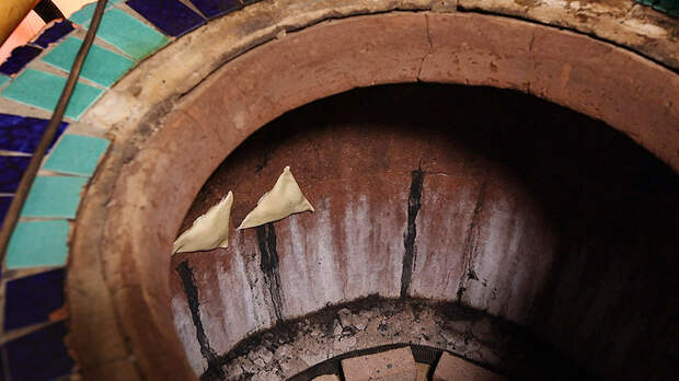 Блюдо готовят в тандыре – специальной глиняной печи. На дно кладут раскалённые угли. Треугольные заготовки крепят прямо к стенкам. Так выпечка приобретает неповторимый аромат и хрустящую золотистую корочку.