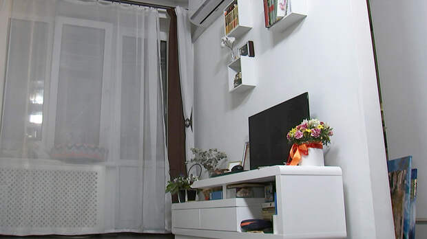 Анастасия живёт в квартире пять лет. Из-за нехватки места выбрала стиль минимализм. Тумба под телевизор, диван и шкаф занимают полкомнаты.
