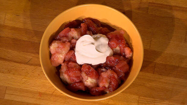 Выложить сверху ложкой кусочки теста. Плотно накрыть кастрюлю и убавить огонь до минимума. Варить 15–18 минут. Огонь выключить и оставить без крышки на 5 минут. Подавать со сливками или сметаной.