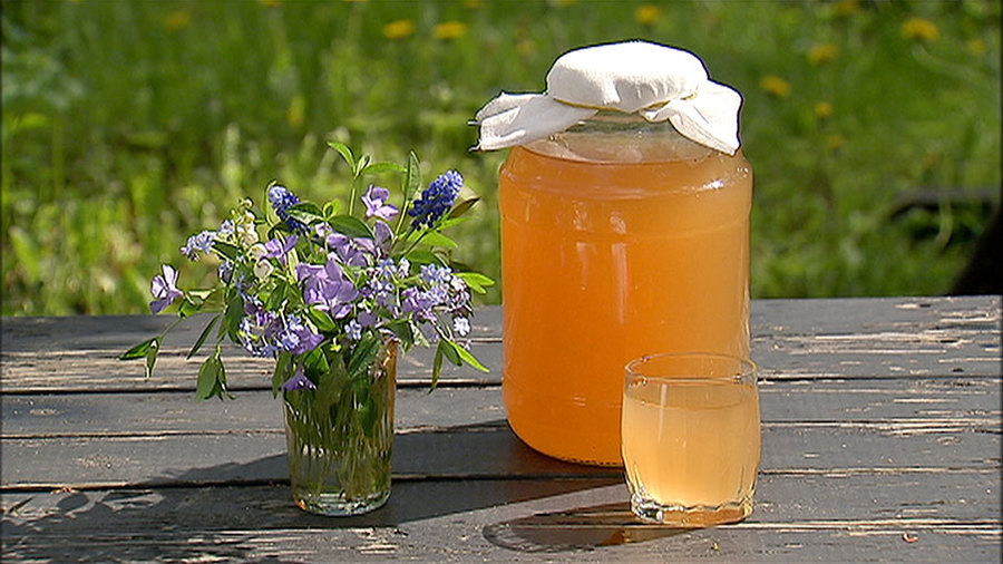 Берём веточки смородины, груши, клёна и вишни. Нарезаем кусочками по 10 см, кипятим 20 минут и процеживаем. В остывший отвар добавляем 5 столовых ложек сахара и 5 г дрожжей. Тщательно перемешиваем, переливаем квас в трёхлитровую банку, накрываем её марлей и отправляем на 3 дня в тёплое место.