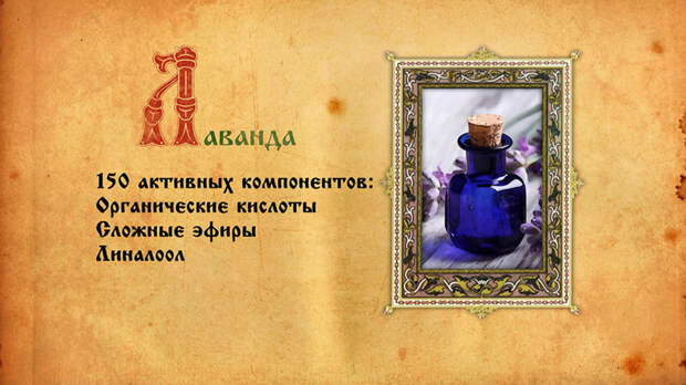 В состав эфирного масла лаванды входит более 150 активных компонентов. В том числе много органических кислот, сложных эфиров и вещество линалоол, которые способствуют быстрому и крепкому сну.