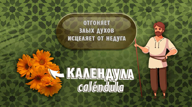 На Руси гирлянды цветов календулы развешивали для отпугивания злых духов, а также верили, что если долго смотреть на календулу, то можно исцелиться от любого недуга. Лепестки цветов содержат очень много полезных веществ: летучие масла, флавоноиды, каротиноиды, горечи, сапонины, смолы, дубильные вещества, органические кислоты, витамины и микроэлементы.